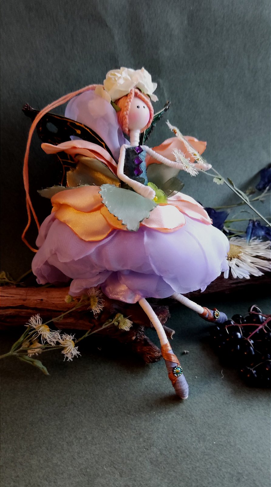 Шёлк,шифон,органза,атлас, проволочный каркас, х/б нитки, деревянная бусина.