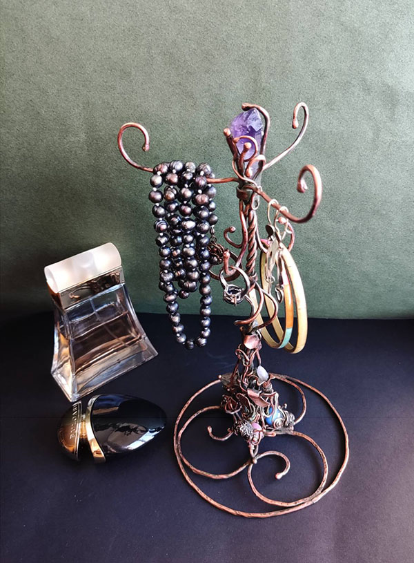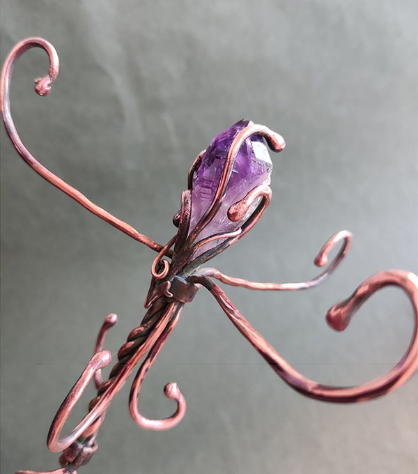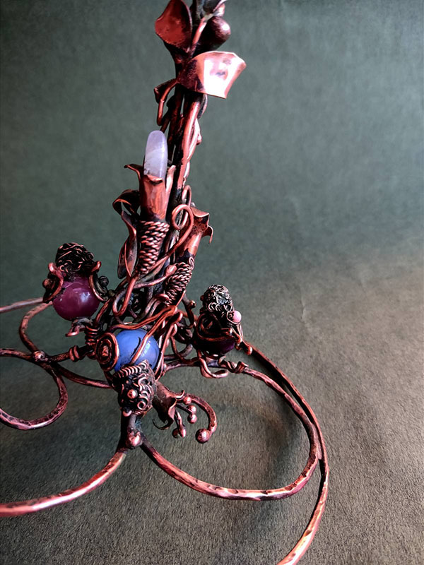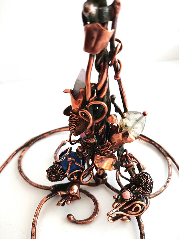 Медь, пайка, стеклянные бусины для птичек, кристаллы аметиста и цитрина.